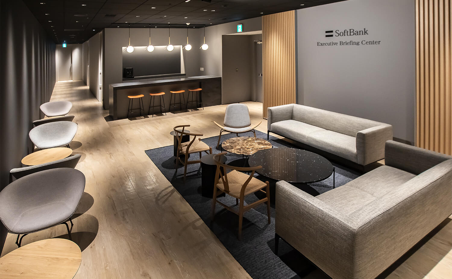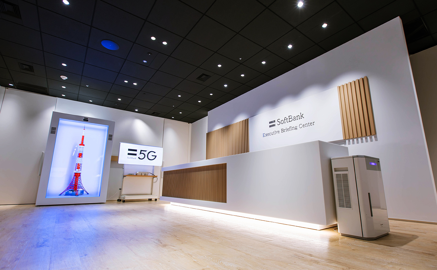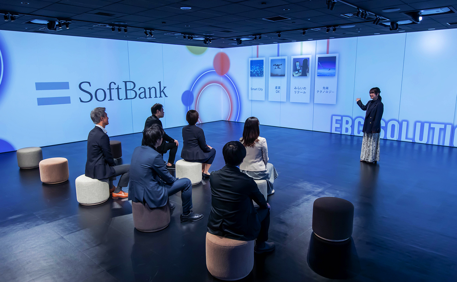 ソフトバンク竹芝本社ビル内に開設されたExecutive Briefing Center(EBC)。AI、IoT、5Gなどを活用した最新ソリューションが常時180以上展示されている体験型のブリーフィングセンターです。未来への道筋を具体的にイメージするための設備や仕掛けをご用意しています。