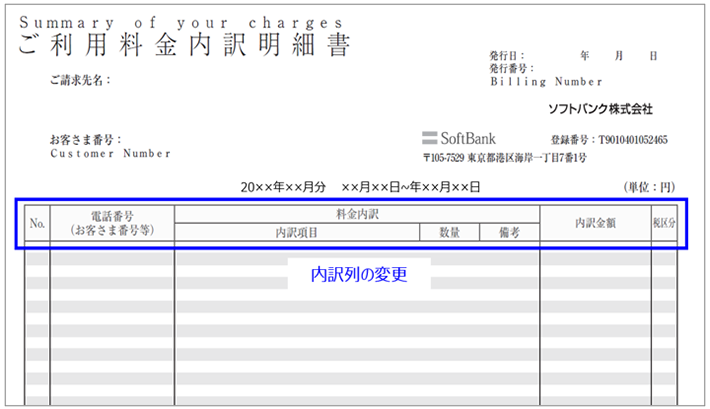 No | 電話番号(お客さま番号等) | 内訳項目 | 数量 | 備考 | 内訳金額 | 税区分