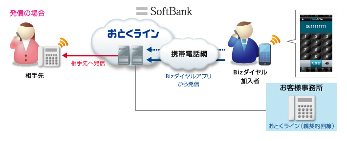 ソフトバンクの「Bizダイヤル」とは、そのクラウドPBXを利用して、スマートフォンから業務用固定電話の番号で発着信が可能な、法人のご契約者様向けのFMCサービスです。
