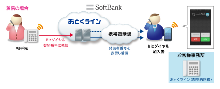 「おとくライン」契約回線のご利用住所に基づいてBizダイヤル契約番号を付加しますので、契約は必須です。また、ソフトバンクが提供する3G、4G通信サービスの契約も必要です。
