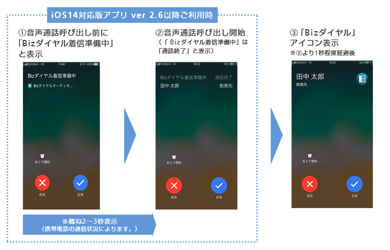 Apple社「iOS14」リリースに伴い、対応版アプリをリリース致しましたが、OS仕様の変更により「Bizダイヤル」着信時の動作が以下の通り変更となりますので、ご注意願います。