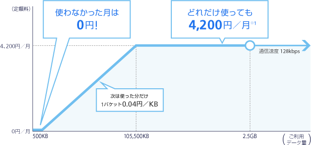- 毎月ご利用のデータ量が基本データ量を超えた場合、請求月末まで通信速度を送受信時最大128kbpsに低速化いたします(通信速度低速化について)。