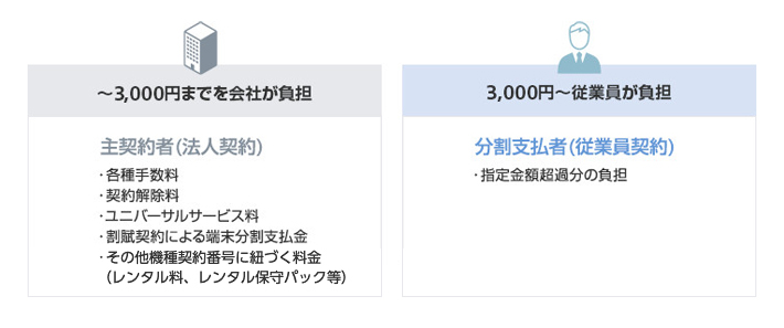 通話料・通信料をすべて分割支払者へ請求、他基本料や定額料、手数料等は法人契約者へ請求します。