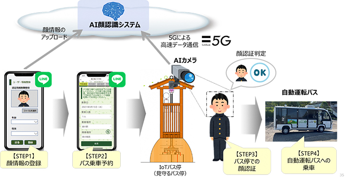この実証実験では、今年8月に実施をした遠隔監視型自動運転に加えて、将来必要となるMaaS自動運転バスに必要なIoTバス停「見守るバス停」(以後、見守るバス停)の実証を行うものです。東急においては遠隔監視型自動運転を行い、ソフトバンクが提供する、AI(人工知能)を活用した顔認識、および、人流解析機能を搭載したシステム(AIカメラ、クラウド、5G SA)を、運行ルートの始点、終点2箇所に設置します。見守るバス停に搭載されたAIカメラの映像に、LINE予約システムを使い事前に顔情報を登録した乗車予約者の顔が検出された場合、顔認証されたとみなし乗車することができます。また通行人がどの程度いるのかを人流解析し、観光シーズンにおける繁忙期は観光客の密を防ぐ施策立案と実施分析へと活用します。見守るバス停から管理システムへの映像伝送は、ソフトバンクの5G SAを活用して行います。この実証実験の結果は、5G SAのユースケースの検証や、商用サービスの改善に生かす予定です。