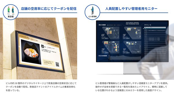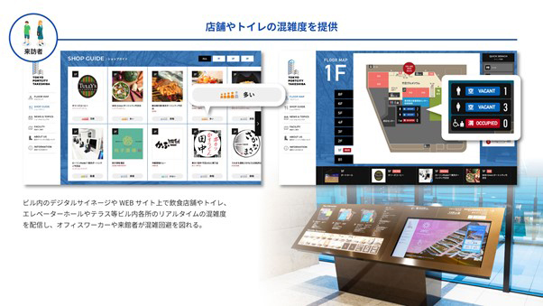 情報提示は利用者に合わせ、ビル来訪者には館内に設置されたデジタルサイネージを活用し、ショップやフロアガイド等、従来どおりの方法で情報にアクセスする際に自然に混雑状況も確認できるようにしています。またビル管理者には、人員配置をする際にビル内各階の混雑状況が瞬時にわかるよう混雑度のみにカラーを使い一覧性を高めたレイアウトの混雑度モニターアプリを提供しました。