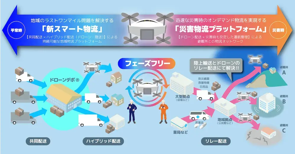 今回の提携では、両社が連携してフェーズフリー型ドローン物流プラットフォームの早期実用化を目指します。これにより、物流の効率化やラストワンマイル配送の課題解決、災害時における物資輸送など、さまざまな社会課題の解決に貢献していきます。