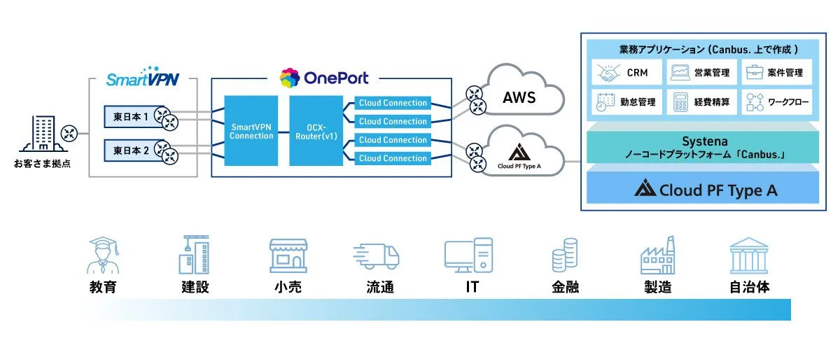 株式会社システナ(以下「システナ」)が提供するノーコードプラットフォーム「Canbus.(キャンバスドット)」の運営基盤として「Cloud PF Type A」が利用されています。「Canbus.」は顧客管理(CRM)や営業管理、案件管理、勤怠管理、経費精算、ワークフローなどの業務アプリをノーコードで簡単に制作できるプラットフォームサービスです。ソブリン性を備えた環境上でこれらの業務アプリが利用できることで、これまでクラウドの利用が制限されていた金融業の承認フローや製造業のサプライチェーン管理、自治体の住民情報管理などいわゆる「重要インフラ15分野」向けへの展開が期待できます。