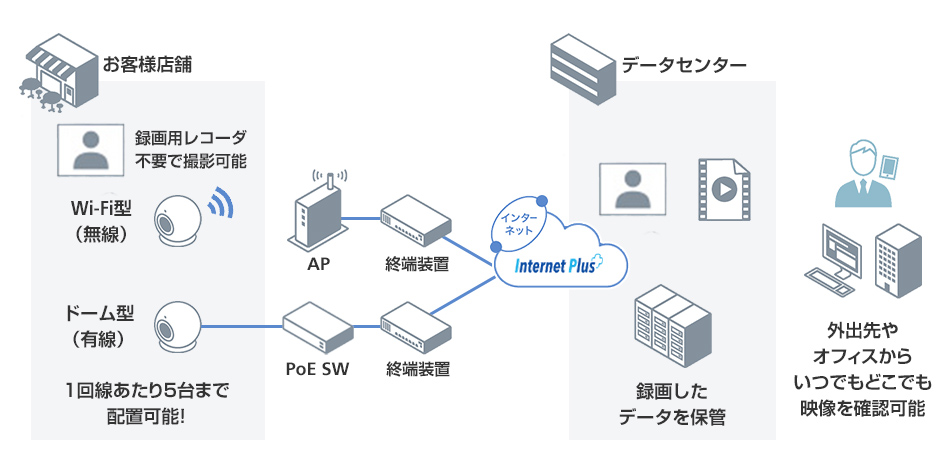 Internet Plus網を利用して全国拠点間でVPN接続が可能です。センター側のVPN機器は東西冗長構成をとっており遅延のない安価なVPNをご提供いたします。