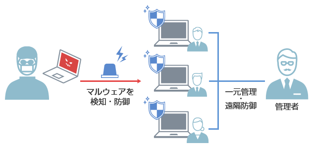 エンドポイントセキュリティは、PCやサーバ、スマートフォンやタブレットなどを標的にした攻撃に有効な対策です。攻撃の検知や防御によってお客さまの情報資産をマルウェアの脅威や機密情報の漏えいから守ります。