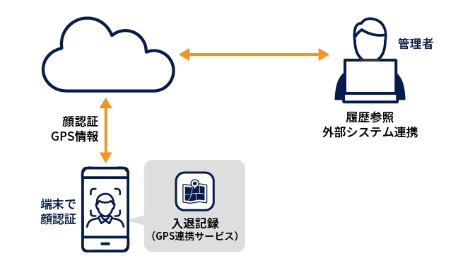 スマートデバイスからの顔認証により「誰が、いつ、どこにいたか」を記録し、勤怠管理や入退管理、本人確認に利用できるクラウドサービスです。