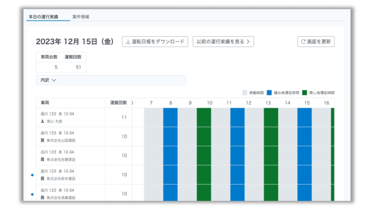 各作業時間(移動、積み込み、降ろし)をタイムラインで表示することで適切な配車台数を把握し、配車効率化。