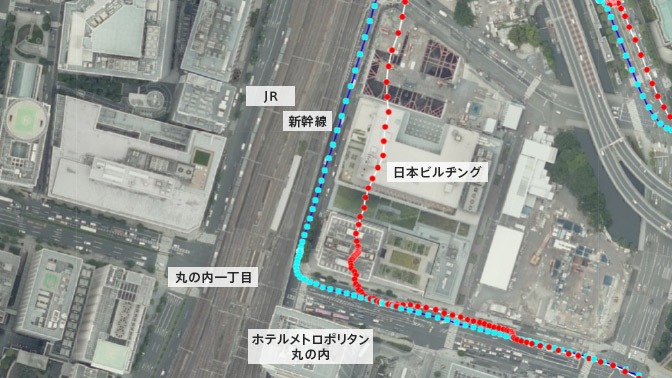 実際にRTK※1とGPSでの測位をしながら街中を走行した検証結果※2です。ichimillは走行車線も的確に捕捉することができます。