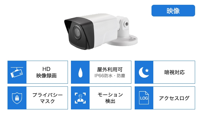 有線(LANケーブル)タイプの屋外向けカメラ。広角レンズのため、1台のカメラで駐車場や建物出入口を広く撮影可能。フルHD対応。