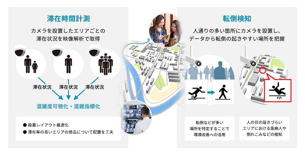 滞在時間計測によるイベント会場の最適化や、転倒検知による安全性の向上を実現します。