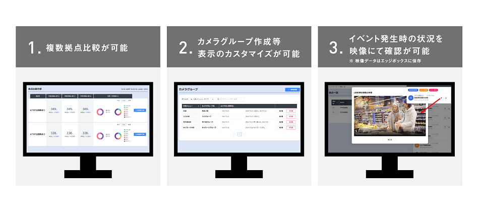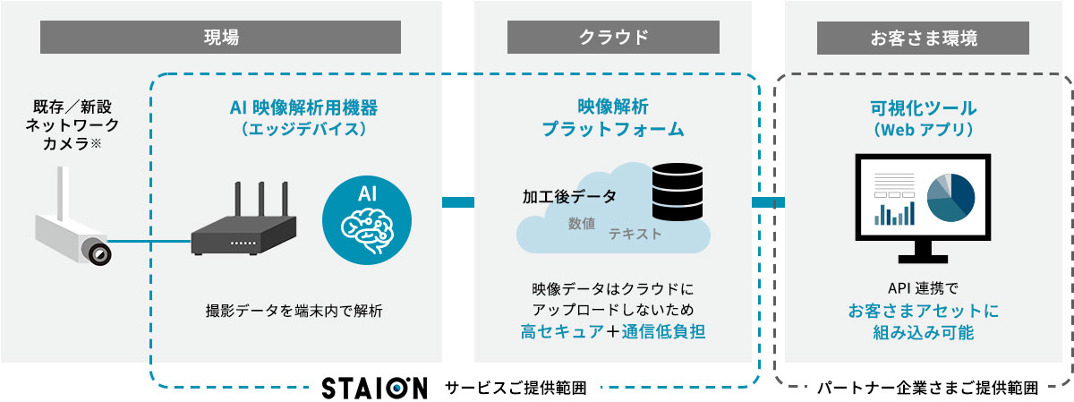 カメラとエッジデバイス(AI映像解析装置)をつなぐことで、膨大な量の映像データを蓄積・分析・解析し、必要な情報へと変換。ビジネス課題解決をサポートします。