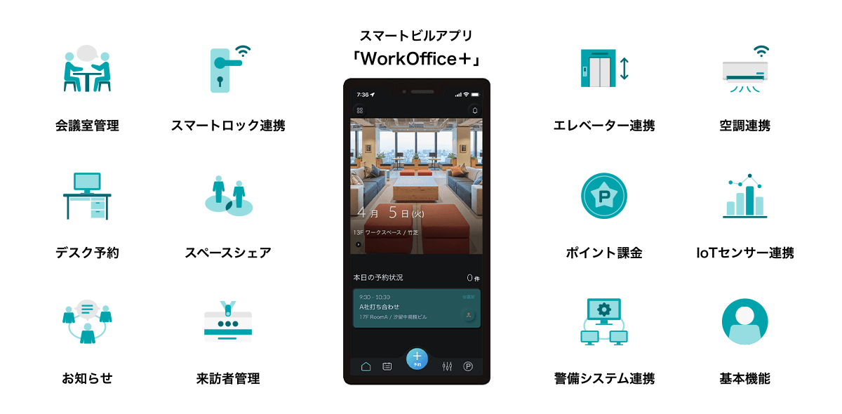 スマートビルアプリケーション「WorkOffice+」は、各機能が相互に連携することで、