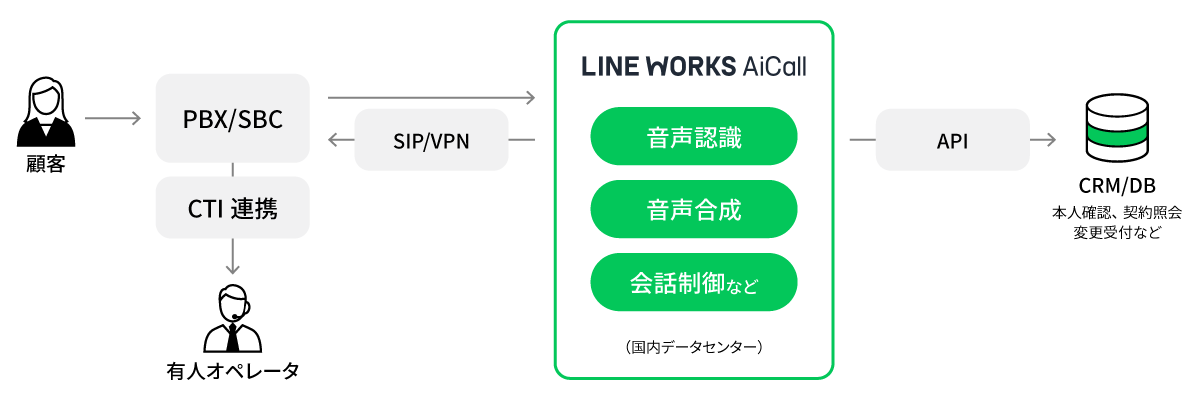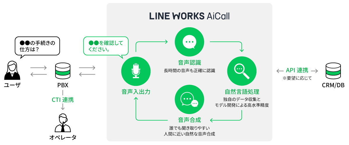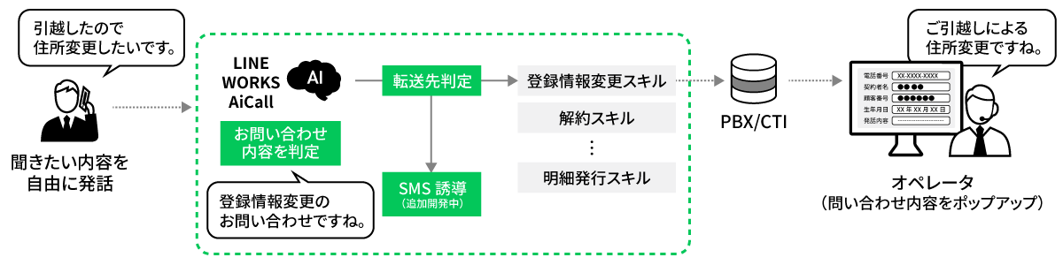 AIを活用した電話自動応答サービスです。お客さまの問い合わせに対して迅速に応答し、転送、メッセージの録音などが可能です。