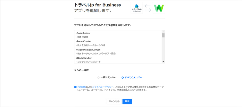 管理者は、LINE WORKS管理画面のアプリより「トラベルjp for Business」を追加し、利用するメンバーに対してアクセス権限を設定します。