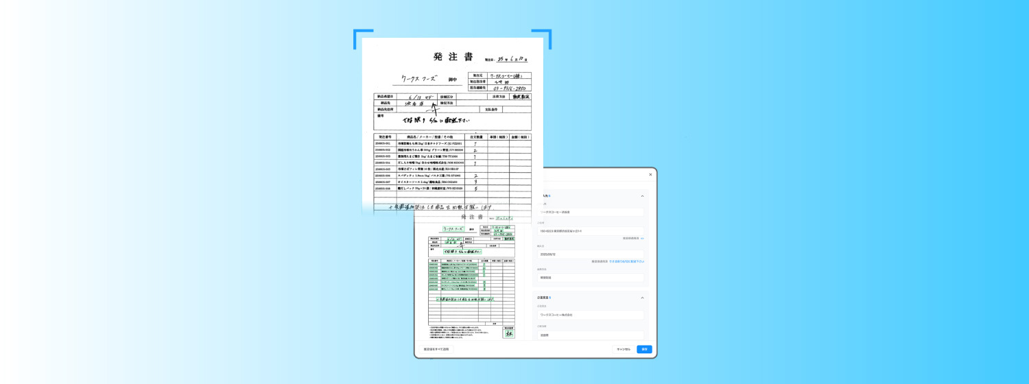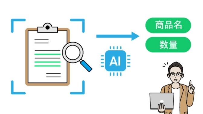 紙の注文書や日報から、商品や数量など必要な情報を読み取る機能。