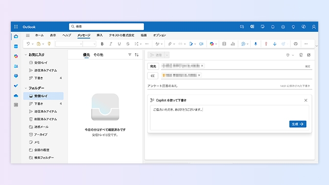 OutlookのCopilotを使い、受信メールの内容や相手に応じた返信メールを自動生成。メール作成の時間を節約。