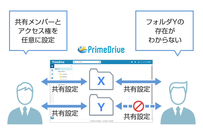 「PrimeDrive」へ登録されたユーザ同士で継続的にフォルダを共有できます。ユーザごとにアクセス権限を設定でき、更に10個の共有権限を任意の組合せで設定することもできるため、柔軟なアクセスコントロールを実現できます。また、既存のフォルダ構成のまま、個別のフォルダごとに共有を設定することも可能です。