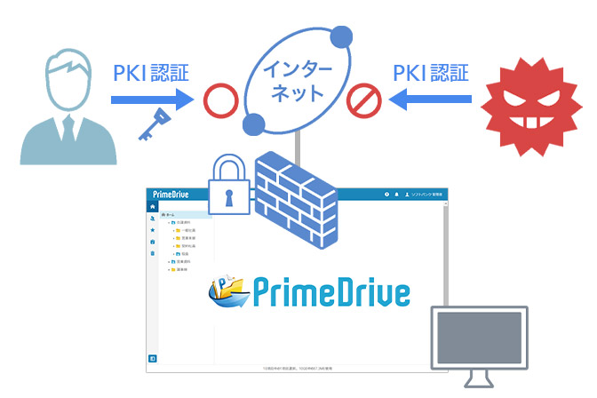 「PrimeDrive」は、「PKIプラットフォーム」と連携しています。クライアント証明書により、ユーザ毎にアクセス可能な端末(PC、iPad、iPhone)を制限できます。