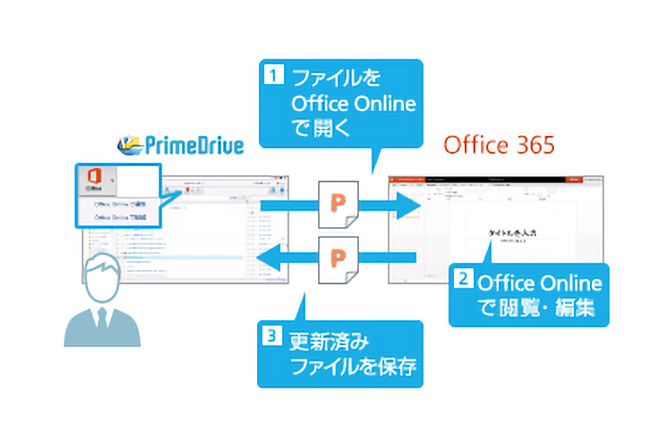 「PrimeDrive」からMicrosoft Word、Excel、Power PointなどのOfficeファイルをOffice Online上で直接編集、または閲覧できます。また、編集したファイルを保存すると「PrimeDrive」上のファイルが更新されます。
