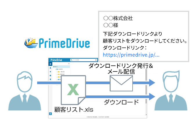 ダウンロードリンクを発行してファイルを送付する、またはメール添付によりファイルを送付できます。出先からの資料送付や、客先でのプレゼンテーション後にその場で資料を送付したい場合に便利な機能です。