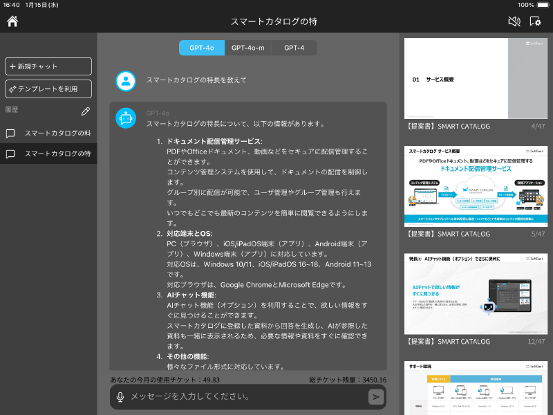 AIがスマートカタログに登録した資料から回答を生成。AIが参照した資料も一緒に表示され、商談や接客時では、資料の閲覧機能で、スムーズなコミュニケーションが可能になります。