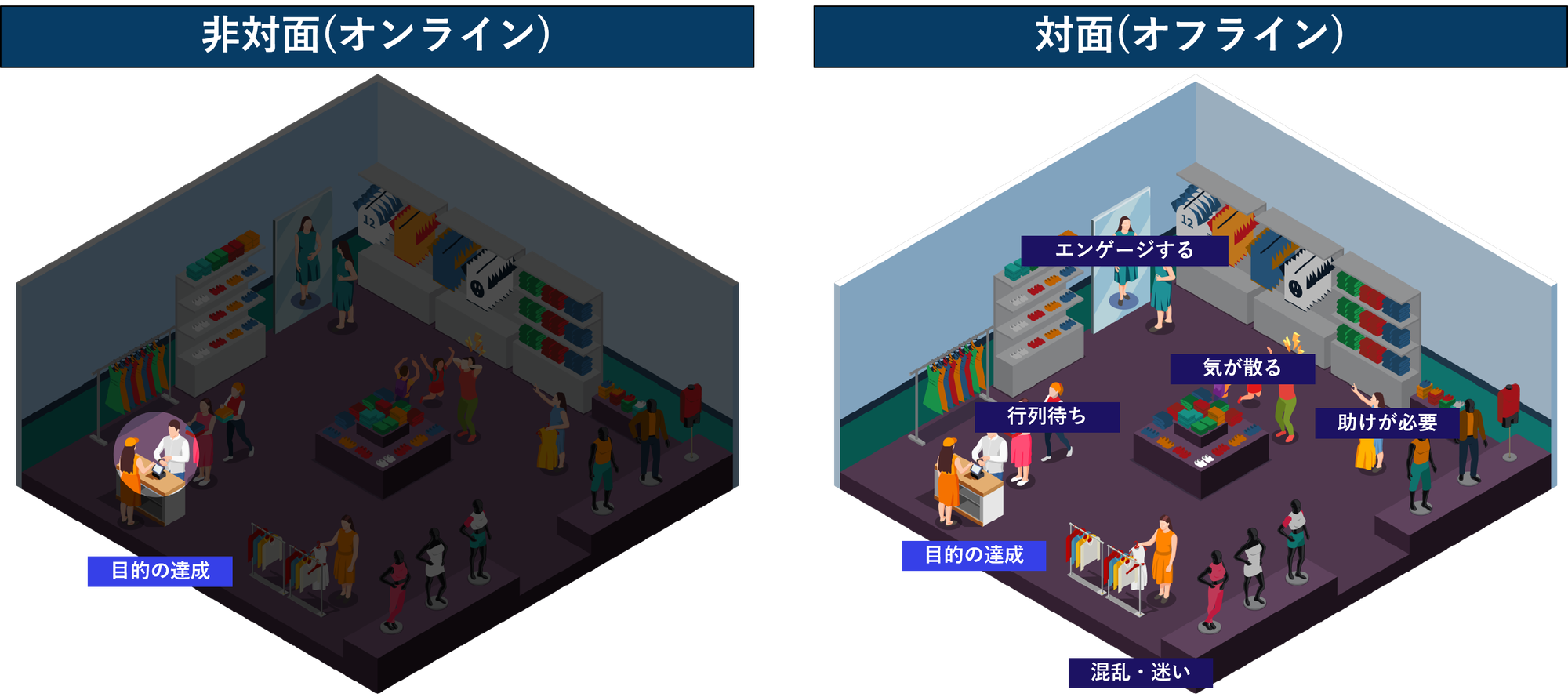 対面型の店舗では、顧客が店内のどこで・どんな体験をして・どう感情が動いたか、その結果、購入したか・しなかったかを運営者がつぶさに把握できるため、それに基づいた改善が日々行われています。
