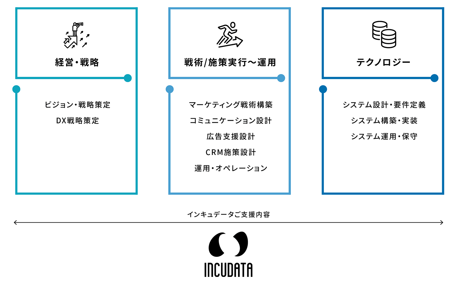 インキュデータは、テクノロジーの導入から、戦略立案・施策の実行、運用まで、お客さまにとって最適なソリューションをワンストップでご提供することで、コミュニケーションの断絶が起こりがちな経営層と現場担当者、技術主幹とマーケティング主幹の隙間を埋めながら、お客さまをご支援いたします。