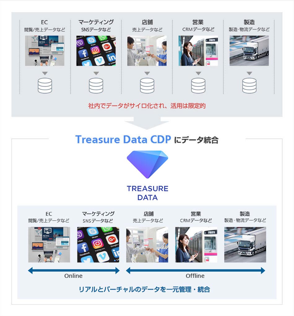 企業においてオンライン・オフラインでの顧客接点が多様化する中、それぞれのデータが散在しサイロ化することが、データ活用の阻害要因として挙げられます。