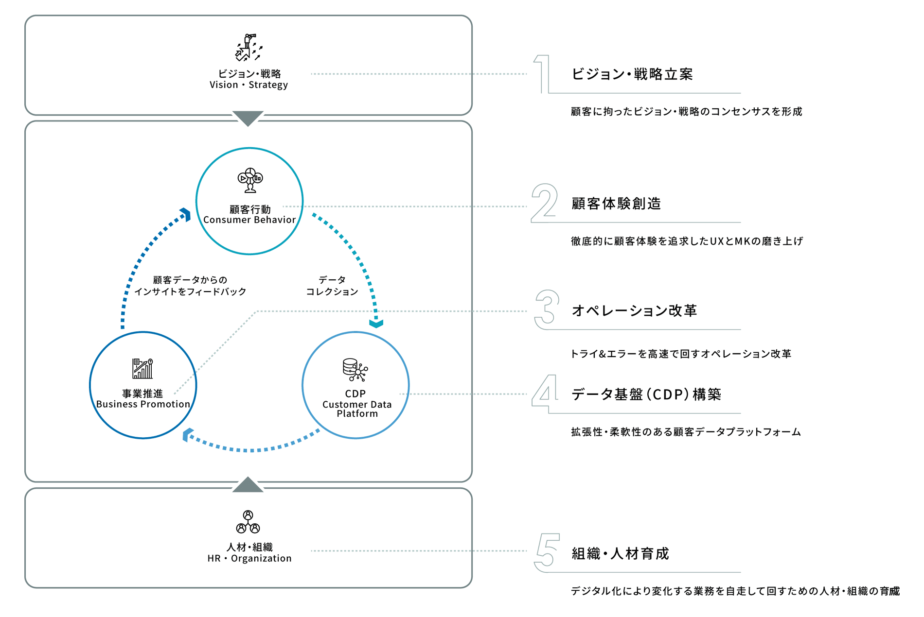 最適なテクノロジーの選択・導入から、迅速で的確な意思決定とマーケティング施策の立案・実行・運用、そしてPDCAのサイクルを回し続けることで、お客さまのデータ活用の取り組みを段階的に発展させ、着実な成果につなげます。