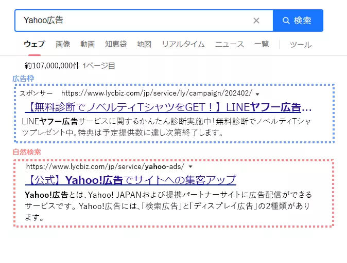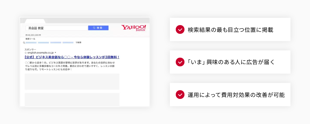 Yahoo! JAPANで検索をした際、検索キーワードに応じて、検索結果ページに表示されるテキスト広告です。