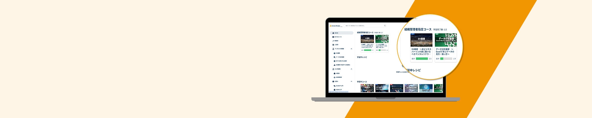 受講者の学習進捗管理、管理者指定コース設定、アセスメント結果の確認など、組織のDX人材育成を効率的に進めるための機能が満載です。CSVダウンロードも可能なので、結果の社内展開・データ分析も可能です。