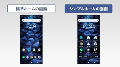 法人向けに使いやすいシンプルなデザインのホーム画面。よく使う連絡先を4つまで登録できるボタンをホーム画面に配置しました。標準ホームの画面と切り替えることが可能です。