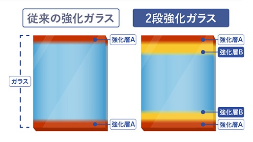 ディスプレイは2段強化ガラスと四隅のフレーム構造の強化により割れにくく、安心して使用できます。