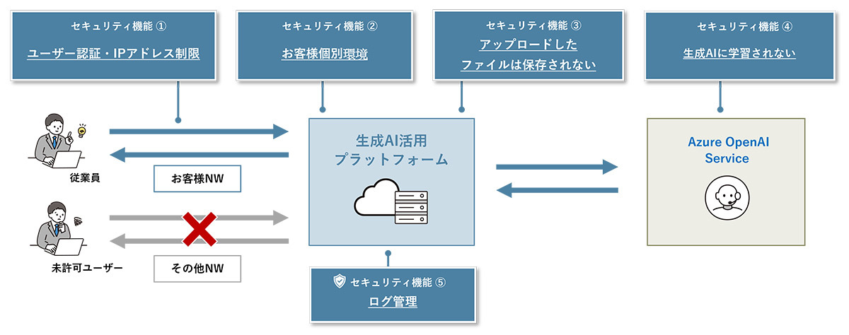ユーザー認証(Entra ID)やIP制限による保護、個別環境の提供、アップロードファイルの自動消去、生成AIの学習からの除外など、セキュリティ対策を徹底しているため、安心して利用することができます。