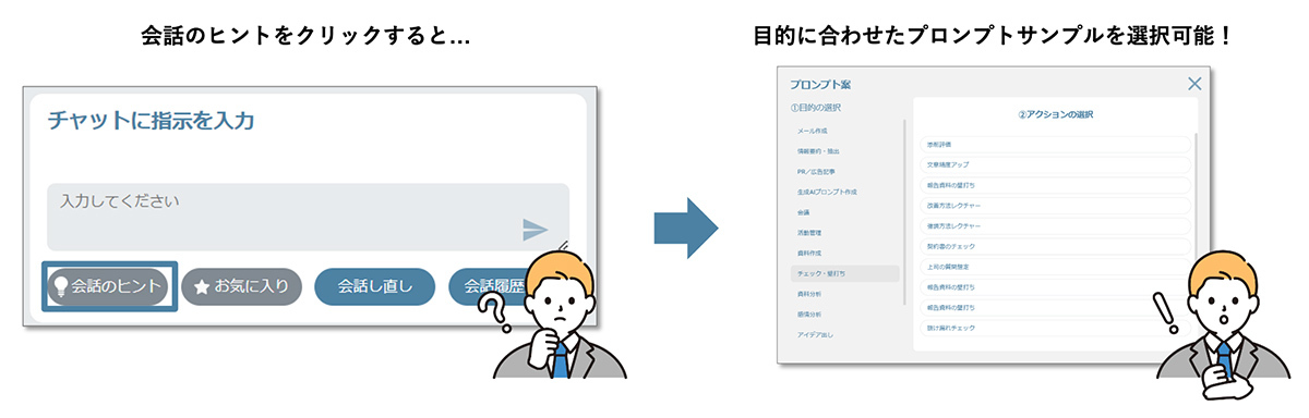 100種類以上のプロンプトサンプルをご用意しています。誰でも迷うことなく、すぐに生成AIを活用することができます。