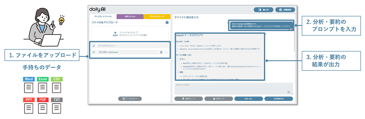 Webブラウザから対象ファイルをアップロードするだけで、ファイルの分析や要約、異なるファイル形式を横断した分析が簡単に実施できます。