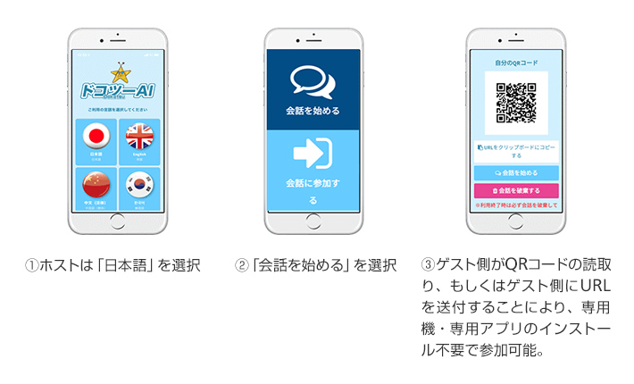 ホスト側はApp store(iOSの場合)、Play store(Androidの場合)からダウンロードしたアプリで利用します。ゲストへはQRコードやURLを送って、そこからペアリングしてもらえば利用可能。ゲスト側には専用機やアプリのインストールも不要です。(PCブラウザでも利用可)