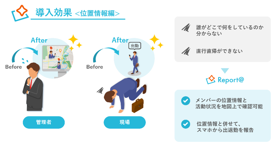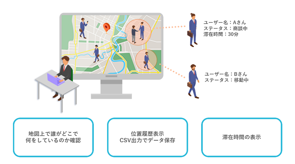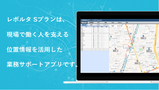 DP Report@(レポルタ) Sプランは、Googleマップを活用した位置情報サービスです。現場社員の位置情報を、登録された顧客情報と一緒に閲覧し、「今誰がどこにいるか」「過去どういった動きをしていたか」を見える化します。アプリから収集したリアルデータを活用していくことで、それぞれの業務プロセス改善に繋げます。