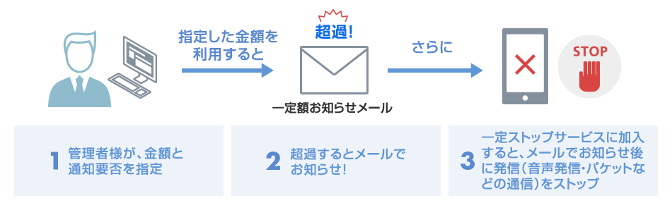 月の途中で通話料・通信料の日次概算料金の合計金額がお客さまの設定した金額を超過すると、SMSやEメールでお知らせ後に発信を停止するサービスです。