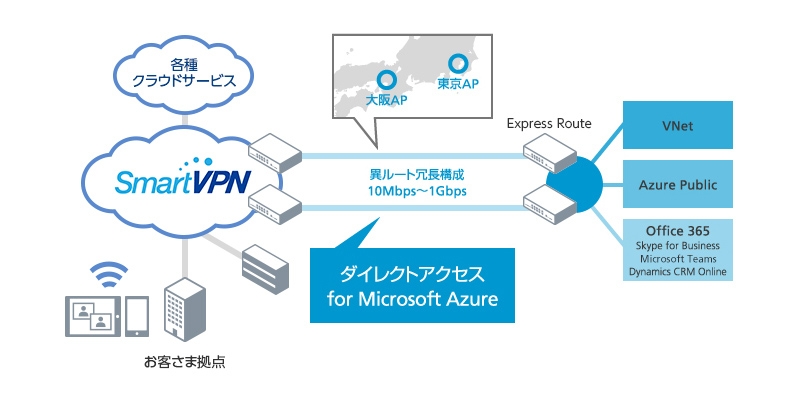 Azure VNet(仮想プライベートクラウド)への閉域接続、Azureパブリックサービスへの直接接続、オプションとして Office 365、Microsoft Teamsおよび Skype for Business、Dynamics CRM Online への接続をご利用可能です。
