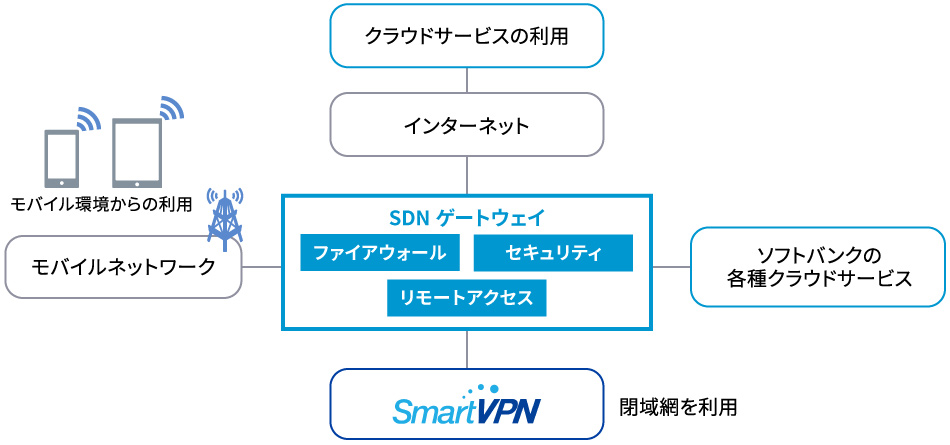 SDNやNFVの技術により、クラウド、モバイル活用時代のビジネススタイルの変化に柔軟に対応するのが「SDNゲートウェイ」サービスです。「SmartVPN」など閉域網からのクラウドサービス利用やモバイル利用に必要なファイアウォール、リモートアクセス、セキュリティ機能をご利用可能です。