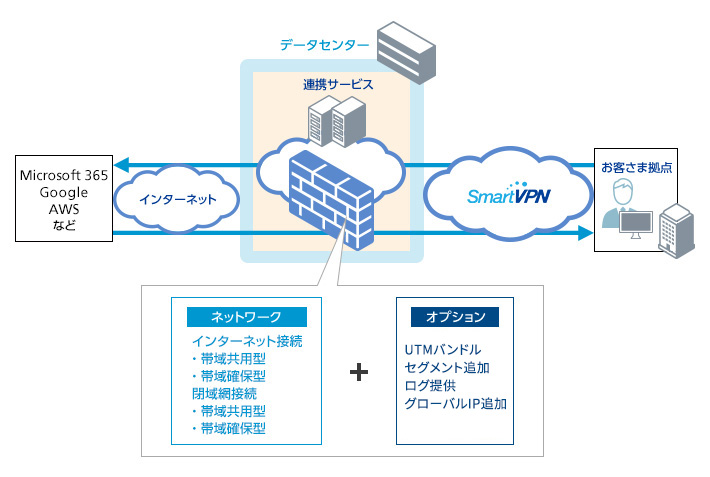 「セキュアインターネットアクセス3」に標準で搭載しているファイアウォールに「アンチウイルス」「アンチスパム」「Webフィルタ」等の機能を付加できるUTMバンドルオプションサービスをご用意しています。