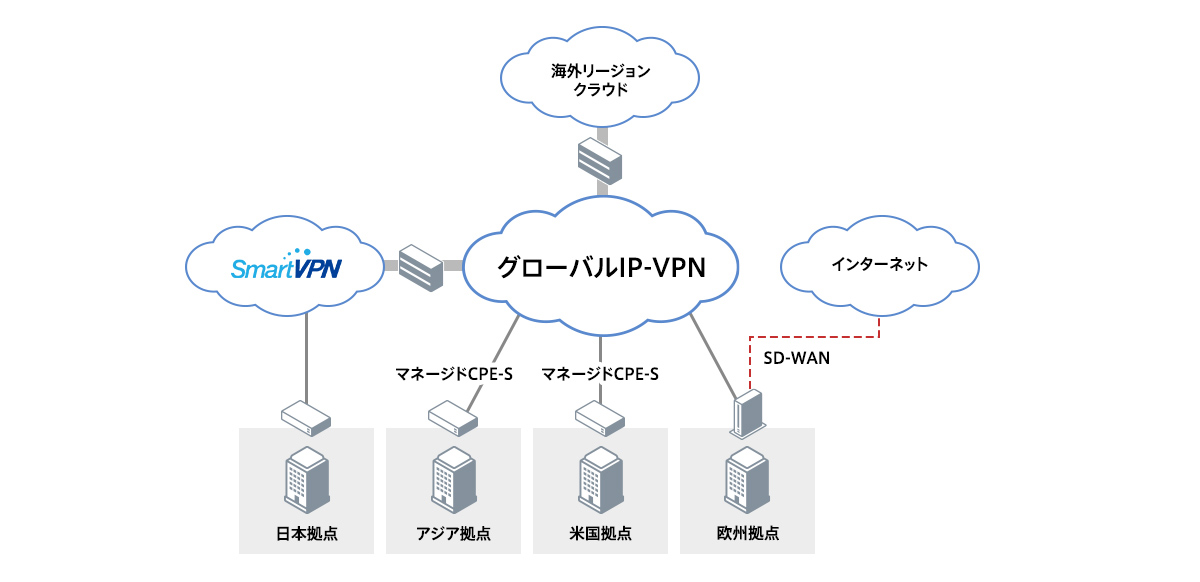 インターネット経由で閉域網への接続を可能にします。海外拠点のインターネットサービスも提供可能です。