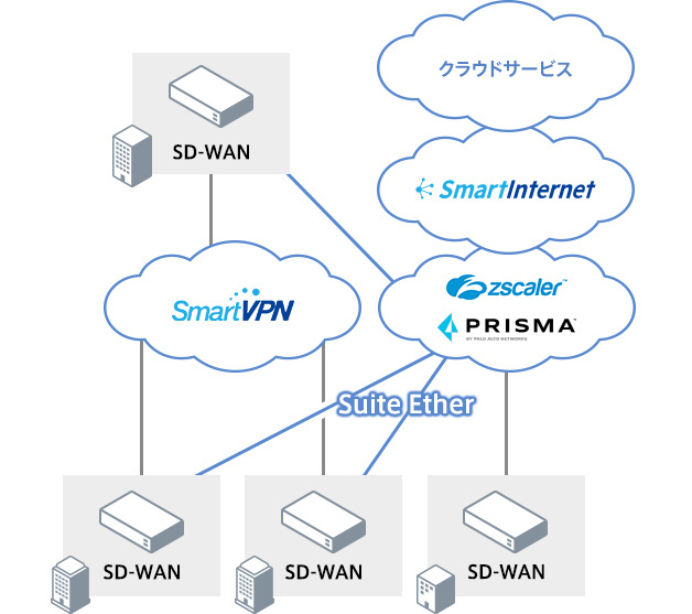 SmartVPNなら、ICT基盤を支えるビジネスリソースをクラウド集約しても、さまざまなデバイスから必要なビジネスリソースにセキュアにアクセスすることができます。柔軟性と迅速性を備えたクラウドとの親和性の高いSmartVPNは、導入期間の短縮や運用の効率化も同時に実現します。