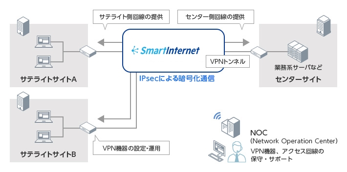 マネージドVPNでは、インターネットVPNネットワークを構成する機器として、本サービスにて提供する機器を限定させていただきます。お客さまにて用意されたVPN機器によってサイトを構成し、IPSec通信を行う事はできません。
