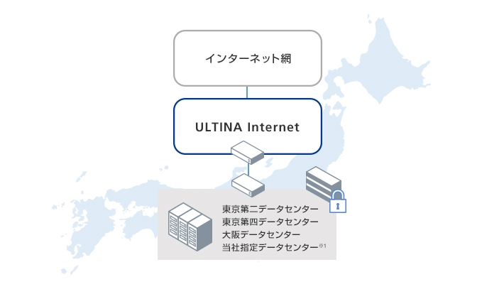 データセンター構内の「ULTINA Internet」 バックボーンへイーサネットにて直結し、バックボーン接続ルータまでの帯域保証型であるため、ISP・ASPといった各種サービスプロバイダのお客さまや、帯域確保が必要なお客さまに最適なサービスです。